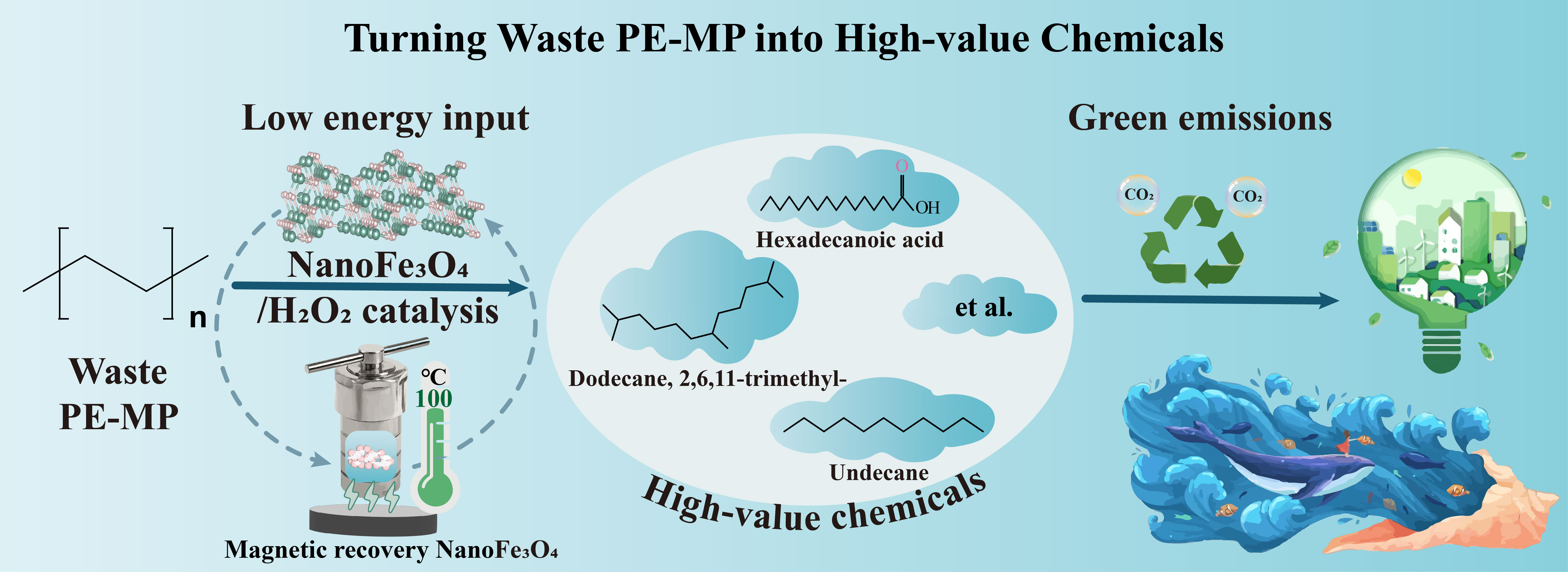 本研究创新性地利用纳米Fe3O4的过氧化物酶样活性,在100℃的温和条件下持续产生羟基自由基(·OH),实现对聚乙烯微塑料中C–C键的选择性断裂。该过程在7小时内实现了约50%的微塑料转化,将其高效转化为烷烃、棕榈酸、醇类等多种高附加值化学品,产物具有低生态毒性,部分甚至可作为微生物碳源促进植物生长。该系统在低于聚乙烯熔点的温度下运行,避免了高温导致的反应失控和有害物质生成。通过密度泛函理论计算与实验表征相结合,研究揭示了纳米Fe3O4表面Fe2+/Fe3+循环促进·OH持续生成的催化机制,其活化能比传统芬顿催化剂降低6.2%,从而在低温下仍具有高催化效率。此外,研究团队开展了系统的生命周期评价与技术经济分析,结果表明该过程碳足迹仅为1.53 kg CO2 eq/kg MPs,比焚烧处理降低49%,且每处理1公斤微塑料可实现约0.73美元的净收益,表现出良好的环境与经济效益。