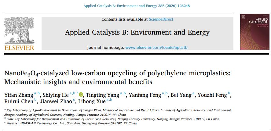 农业生态环境正面临微塑料污染的严峻挑战,对农产品安全和生态系统健康构成持续威胁。当前,高温热解、光催化等传统废弃塑料处理技术因能耗高、条件苛刻、易产生有毒副产物等局限,难以大规模推广。如何在温和条件下实现微塑料的高效转化与资源化利用,已成为农业面源污染治理领域的关键难题。近日,资环所农业面源污染治理创新团队取得重要突破,提出了一种基于纳米酶Fe3O4的温和类芬顿催化新技术,实现了聚乙烯微塑料的高效、低碳升级回收,有望推动农业环境微塑料污染治理向绿色、可持续方向迈进。研究成果“NanoFe3O4-catalyzed low-carbon upcycling of polyethylene microplastics: Mechanistic insights and environmental benefits”发表在环境与能源催化领域权威期刊《Applied Catalysis B: Environment and Energy》(一区Top期刊,IF 21.1)上。