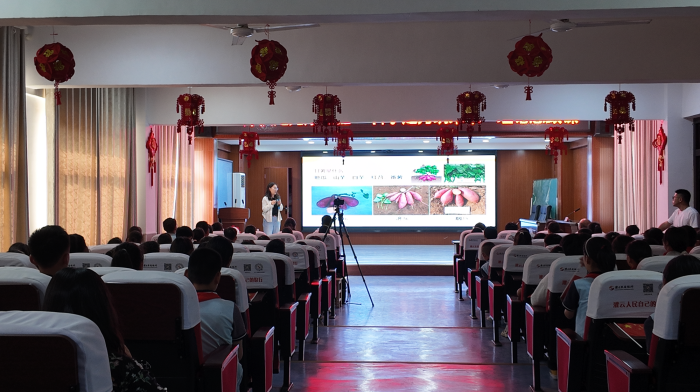 活动当天,刘敏捷首先介绍了灌云县甘薯种植历史及其30年发展变迁。随后一场别开生面的“泥土里的甜蜜宝藏-甘薯”科普课堂在多媒体教室开讲。我院资环所袁洁博士通过动画短片《漂洋过海来见你》和《甘薯的发迹之路》,向孩子们展示了甘薯从南美洲漂洋过海到中国的千年迁徙史。当大屏幕上出现白色、紫色、橙色、渐变色等薯肉切面时,让孩子们体会到了:原来红薯不只有黄色!“甘薯十级吃货指南”更是点燃课堂:从焦香的烤红薯到酥脆的甘薯脆片,让孩子们大开眼界。农业农村部南京农机化研究所王公仆副研究员则介绍了甘薯的种植和收获技术,当全自动移栽机快速完成半亩地栽种的视频播放时,让学生们感受到了机械化的魅力,在孩子心中播下了农业科技的种子。